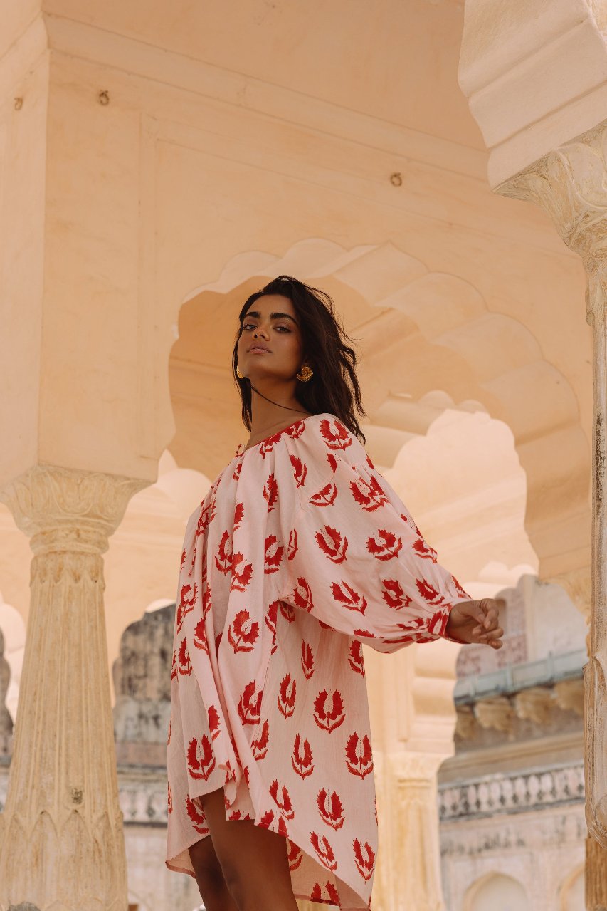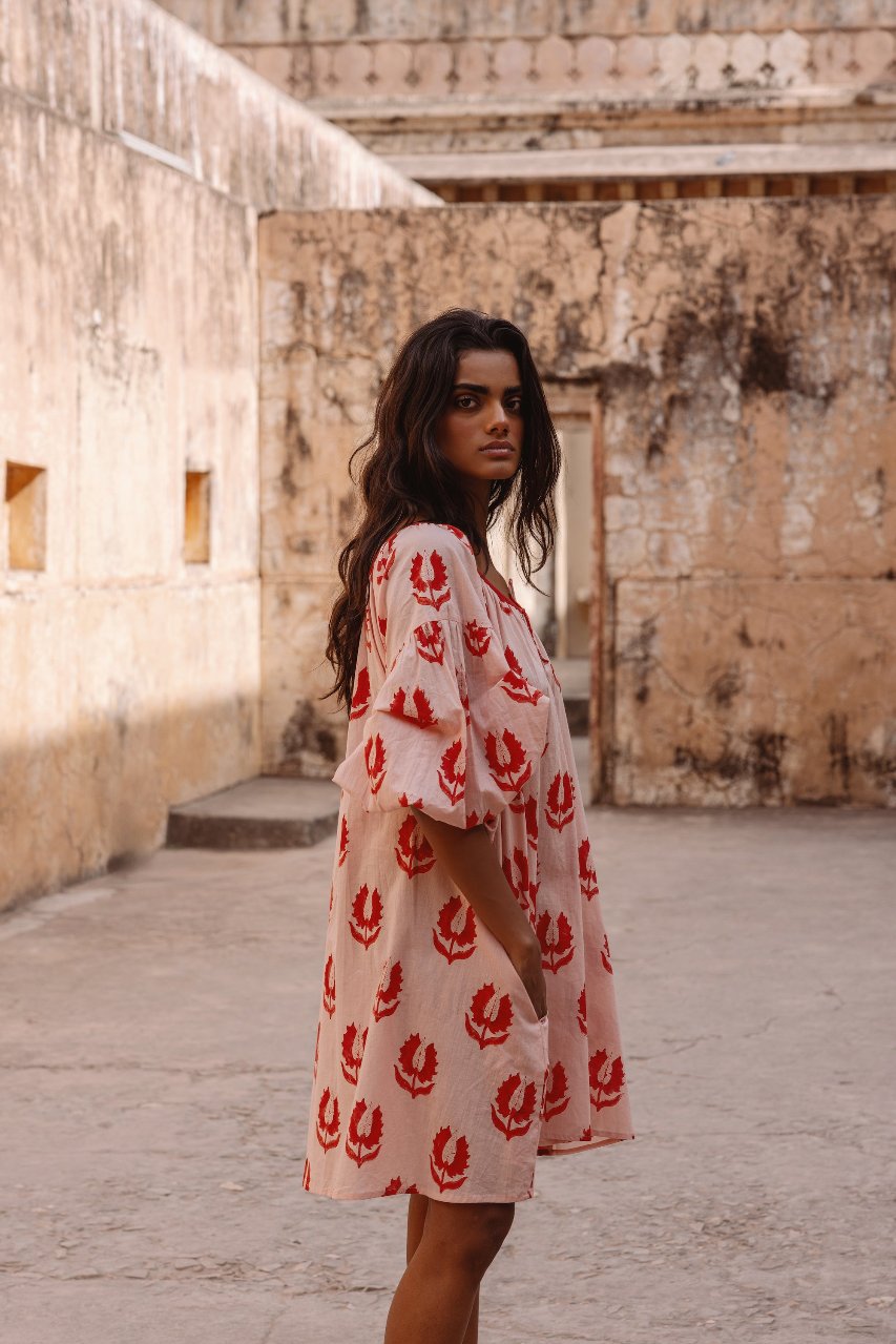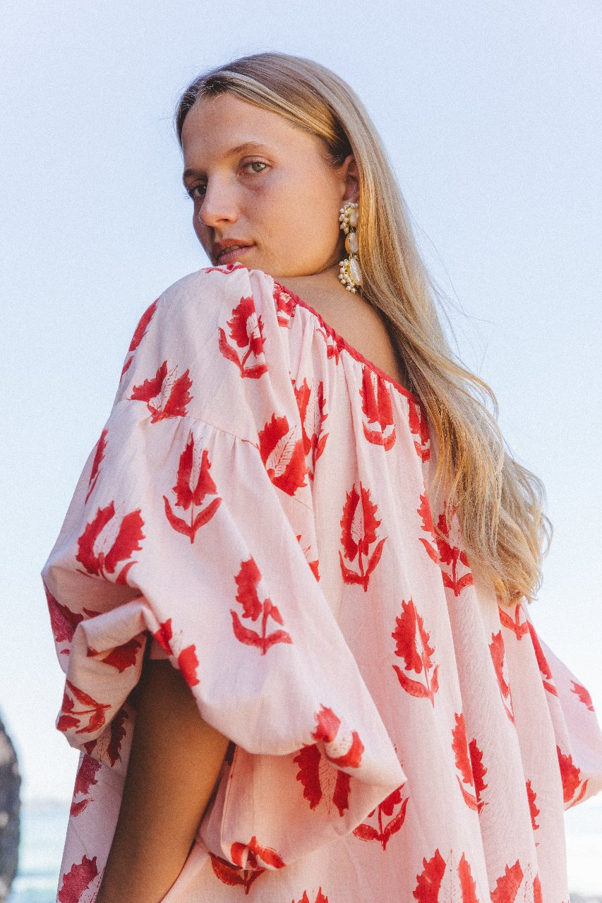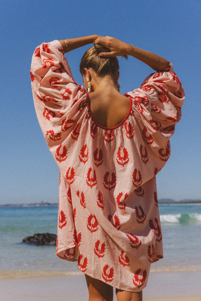 The Ria Mini Dress has been ethically handcrafted with 100% cotton into the most comfortably soft, billowing silhouette. Featuring an adjustable gathering at the neckline with a tie, pockets, and cuffs to finish the delightfully large sleeves. Adorned with hand printed florals, the making of this dress serves to support the preservation of hand craftsmanship and women empowerment in India.