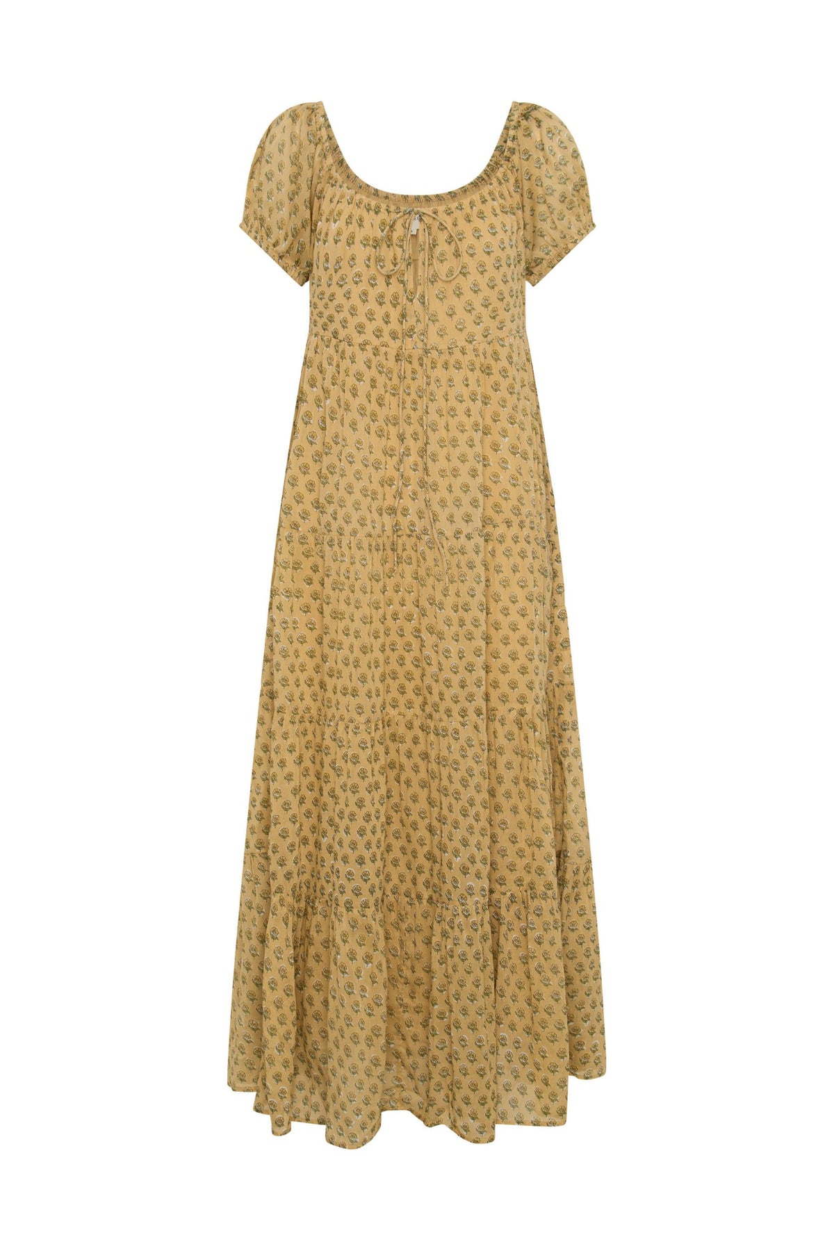 The Sita Maxi Dress in Daffodil has been lovingly and mindfully hand-crafted using beautiful hand screen printed fabric. This flattering feminine silhouette adorned with hand-placed florals features an elasticated scoop neckline finished with a self-adjustable tie at the bust, elasticated sleeves, and a captivating floor length tiered design bringing the vibrant golden hues to life.