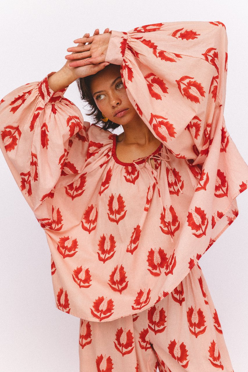 The Ria Blouse has been ethically handcrafted with 100% cotton into the most comfortably soft, billowing blouse. Featuring an adjustable gathering at the neckline with a tie, and cuffs to finish the delightfully large sleeves. Adorned with hand placed florals, the making of this blouse serves to support the preservation of hand craftsmanship and women empowerment in India.