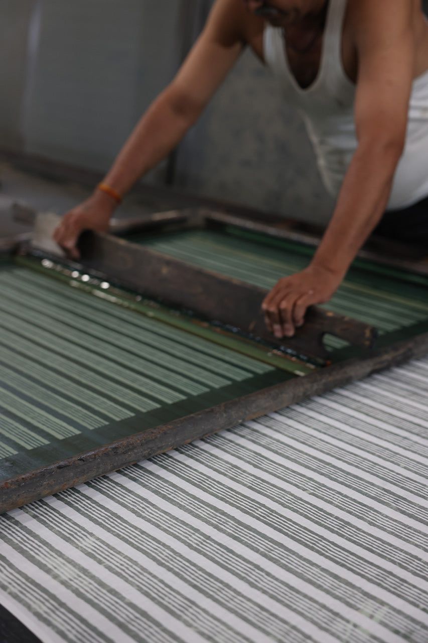 The Spearmint Midi Dress is a fresh expression of our signature Kyra silhouette, reimagined through the careful craft of hand screen printing. Soft green hues come to life in a delicate design, layered by skilled artisans using large stencils and gentle, sweeping strokes — giving each dress its own subtle character and charm. Featuring Kyra's romantic billowed sleeves, optional front-tie detailing and hidden pockets.