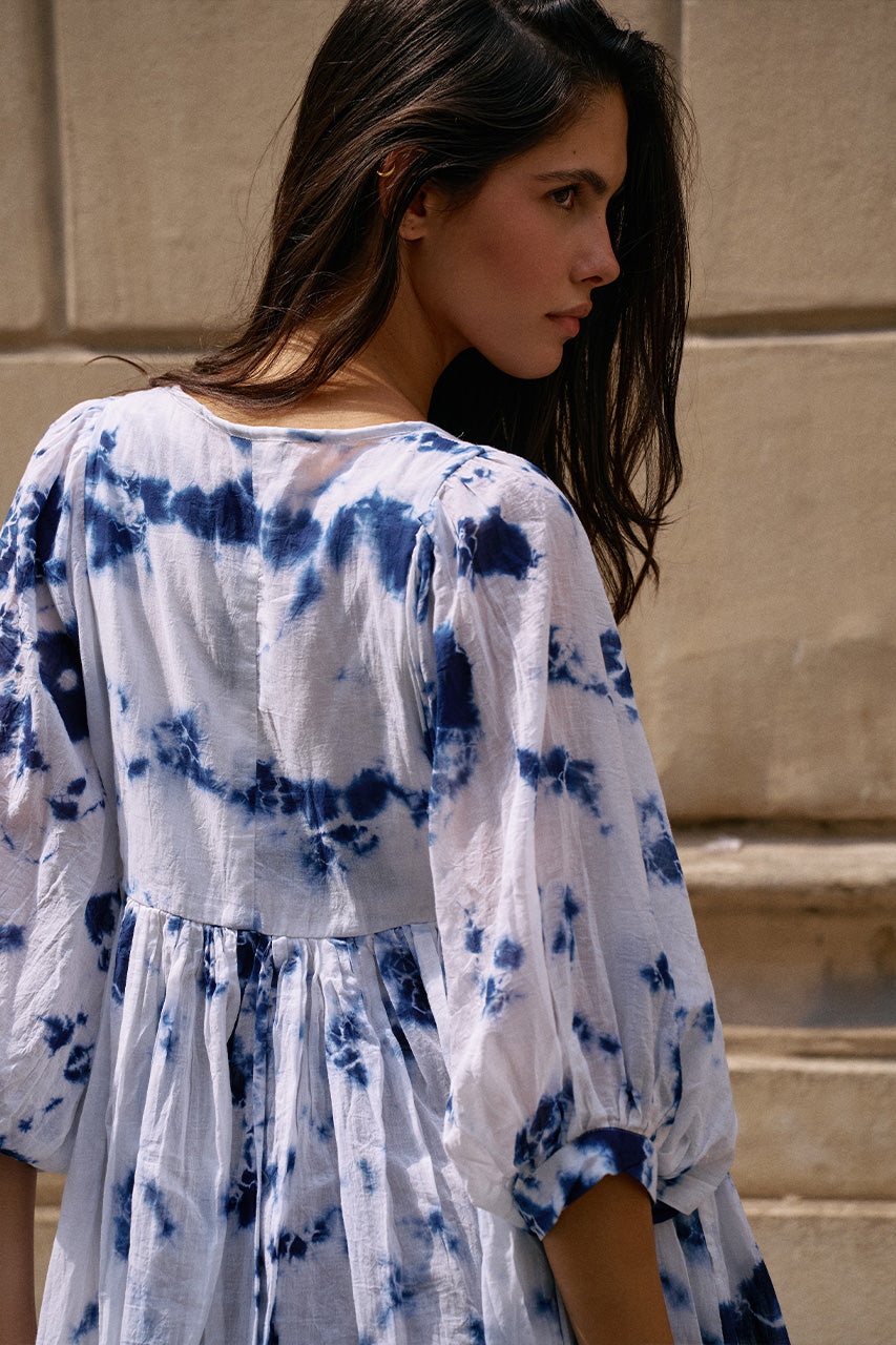 The Kyra Mini Dress in Deep Sea is our first-ever tie-dye interpretation of the signature Kyra design. Each piece is hand-tie-dyed by artisans using the Badal (“cloud”) technique, blending ocean-inspired hues in a refined expression of bohemian elegance.